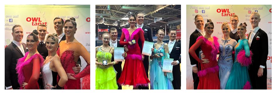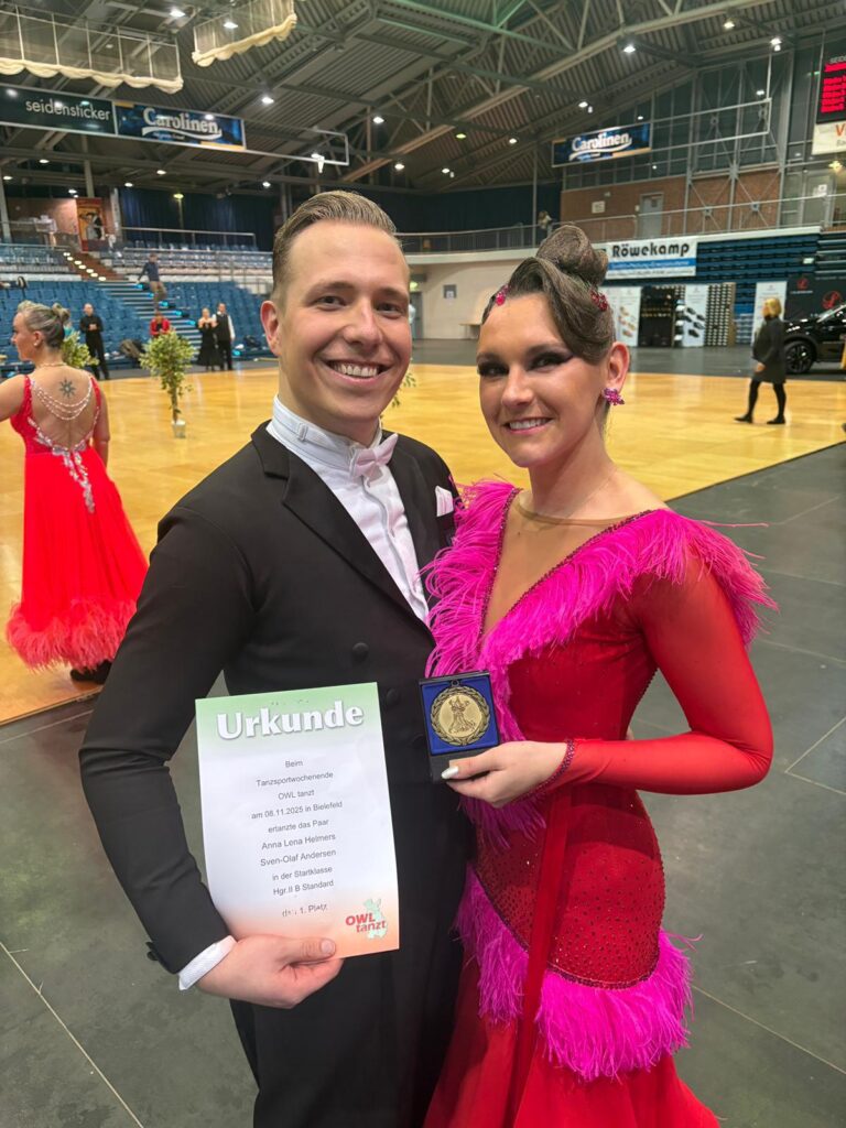 Am 8. und 9. November traf sich die Tanzwelt in Bielefeld bei „OWL tanzt“ in der Seidenstickerhalle in Bielefeld. Über 1.100 Startmeldungen waren für das 3-Flächen-Turnier eingegangen, auch unsere Paare waren wie jedes Jahr vor Ort: Für Sven & Anna Lena war es jedoch die Premiere, denn sie trainieren erst seit wenigen Wochen zusammen bei Christian – mit Erfolg, denn am Samstag konnten sie in der Hauptgruppe II B Standard mit ihrem Sieg von 16 Paaren gleich klar machen, wohin die Reise gehen soll. Wir gratulieren von Herzen und wünschen weiterhin viel Freude und Erfolg!